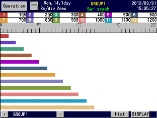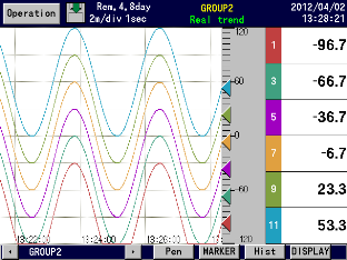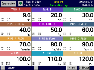 Measured data display (Trend screen, Data screen, Bar-graph screen) Historical trend display (simultaneous display with Real-time trend is available) Information display (alarm display, marker list, file list) Setting screen (alarm, computation, memory, system, maintenance, communication, etc.) |