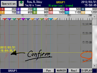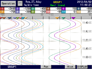 12 colors selectable Display screen--- 5 screens (5 groups) Display points --- Maximum 44 points/screen Time axis direction --- Vertical or horizontal Line width --- 1/3/5 dot selectable Scale display --- 4 scales Tag/data display --- Show/hide selectable Marker display |