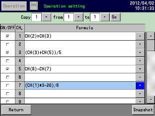 Arithmetic operations Addition, subtraction, multiplication, division, remainder, exponential Comparison operations Equality, inequality, great, less, equality /great, equality / less Logical operations AND, OR, XOR, NOT General functions Round-up, round-down, absolute value, square root, exponent of e, natural logarithm, common logarithm Integration operations Analog integration, digital integration Channel data operations Measured data computation, calculated data computation Others Dew point, relative humidity, F-value, remaining amount of CF card |