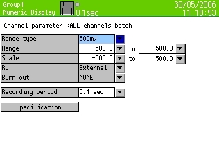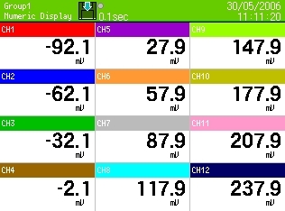 12 colors selectableDisplay screen--- 5 screens (5 groups) Display points --- Maximum 44 points/screen Time axis direction --- Vertical or horizonta lLine width --- 1/3/5 dot selectable Scale display --- 4 scales Tag/data display --- Show/hide selectableMarker display |