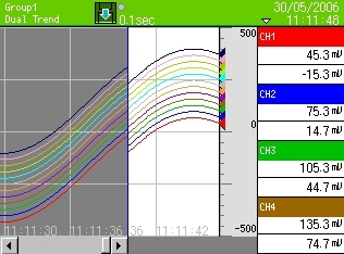 Displays data (measured and virtual) of selected group. Combination display with real-time trend is available.