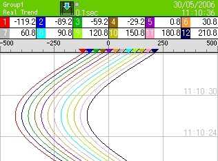 Displays data (measured and virtual) of selected group. Vertical trend and horizontal trend selectable.